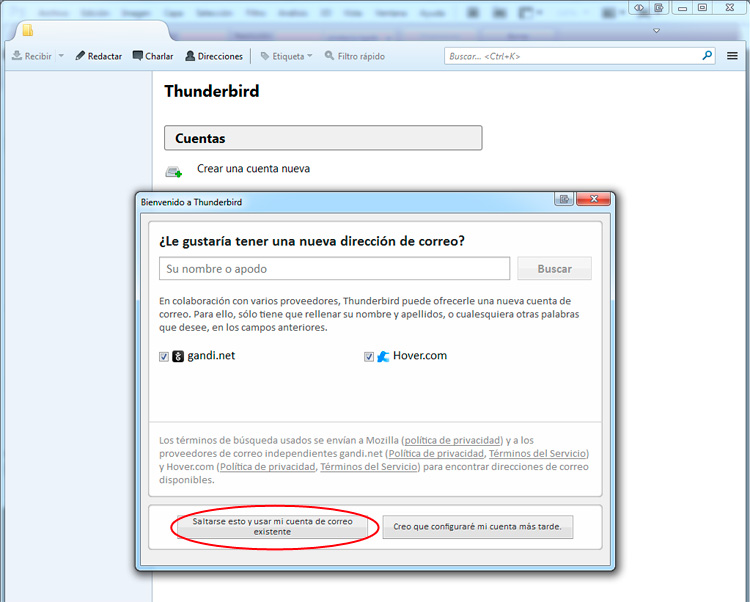 1.- Si es la primera vez que abrimos el Mozilla Thunderbird, veremos la siguiente imagen, donde debemos hacer clic en «Saltarse esto y usar mi cuenta de correo existente».