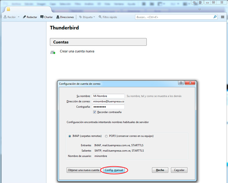 3.- Mozilla Thunderbird detectará de forma automática parte de nuestra configuración, pero de igual forma, debemos hacer clic sobre el botón de «Config. manual».