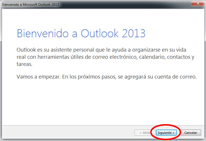 1.- Si es la primera vez que abrimos el programa de Outlook 2013, veremos la siguiente imagen, en la que solo debemos hacer clic en «Siguiente».