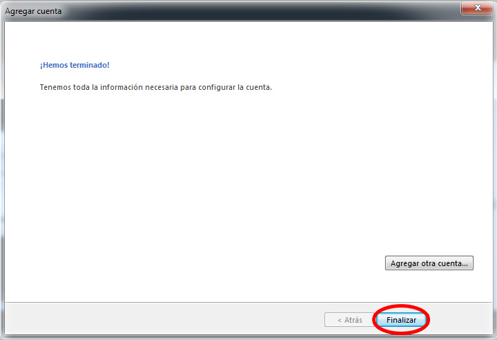 9.- Listo! ya tenemos nuestro correo configurado correctamente en Outlook 2013, solo debemos hacer clic en el botón de «Finalizar», o clic en «Agregar otra cuenta» si queremos, para configurar una cuenta de correo adicional.