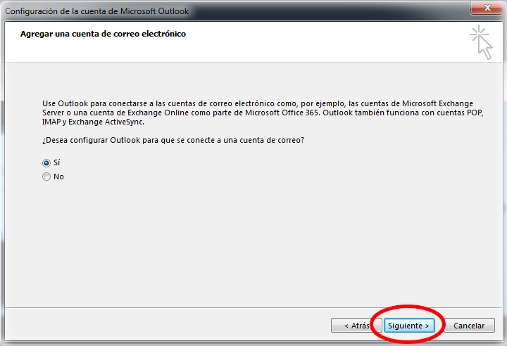 2.- En el 2do paso, solo debemos hacer clic en «Siguiente», ya que Outlook, solo nos pregunta si queremos configurar nuestra cuenta de correo.