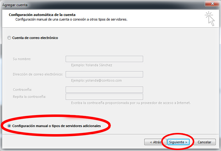 3.- Por defecto, viene seleccionada la opción de «Cuenta de correo electrónico», pero debemos seleccionar la 2da opción, que es la de «Configuración manual o tipos de servidores adicionales», y hacer clic en «Siguiente».