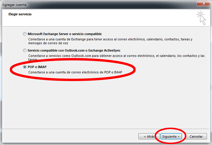 4.- Seleccionaremos la opción de «POP o IMAP», que es la configuración adecuada para añadir nuestra cuenta / buzón de correo; y hacemos clic en el botón de «Siguiente».