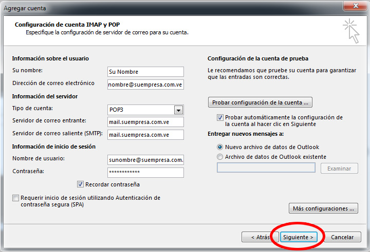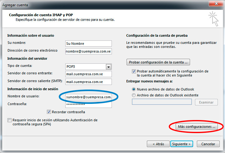 5.- En este paso, rellenaremos todos los datos que nos solicita Outlook 2013, teniendo muy en cuenta que en el campo de «Nombre de Usuario» debemos colocar nuestra dirección de correo completa, por ejemplo «sunombre@suempresa.com.ve».