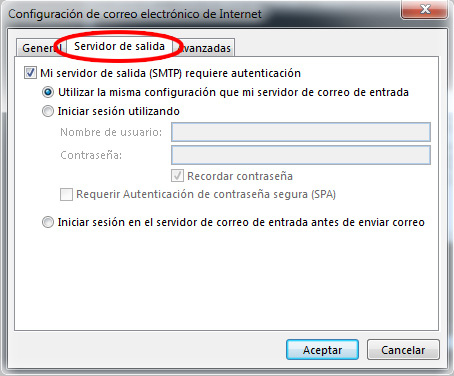 Ahora haremos clic sobre la pestaña de «Servidor de salida», y seleccionaremos las opciones de: