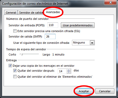 7.- Ahora, haremos clic en la pestaña de «Avanzadas», y cambiaremos el puerto del «Servidor de salida (SMTP)» del 25 que viene por defecto, al puerto 26, y hacemos clic en el botón de «Aceptar».