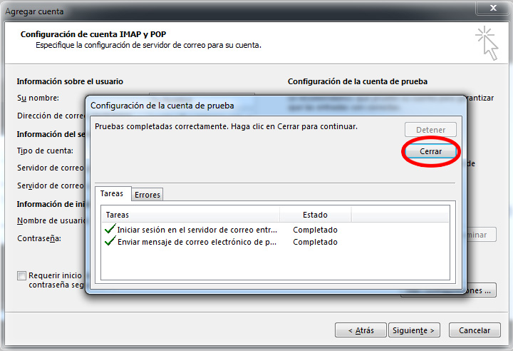 8.- En este momento Outlook 2013 iniciara el proceso de verificar si la configuración añadida es correcta, creando y enviado de forma automática un mensaje de prueba. Si todo es correcto, solo debemos hacer clic en el botón de «Cerrar».