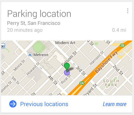 Google está haciendo más fácil volver a donde está estacionado tu carro en una ciudad que no te es familiar, un concierto, o cualquier lugar que desafía a aquellos despistados. La compañía Google now asistente reconocerá donde dejaste tu vehículo y automáticamente realiza seguimiento de donde la localidad de tu carro. No es magia, Google hace todo utilizado el grupo de sensores de tu Smartphone. La compañía admite que esta aplicación pueda fallar. “Tal vez veas que tu carro está estacionado cuando ni siquiera parqueaste”.